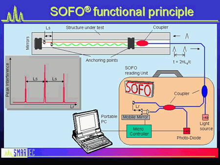 它基于與點光傳感器部分所述相同的白光干涉測量基本原理以上。來自白光源的光通過光纖傳輸?shù)焦鈱W傳感器。這里的傳感器由一個光纖耦合器組成,該光纖耦合器分成兩根不同長度的光纖,每端都有一個微型鏡子。參考該配置作為Mach-Zehnder或傳感干涉儀。入射光脈沖由耦合器分成兩個脈沖,并且在返回時,兩個脈沖在時間上分開t = 2nLs / c,其中n表示玻璃纖維的折射率,Ls 表示纖維的長度差異和c光速。一根光纖連接到被測結構上,而另一根光纖非常接近但沒有連接。結構的變形導致路徑差2nLs 的變化。在這種情況下,它通過使用掃描移動設備來測量