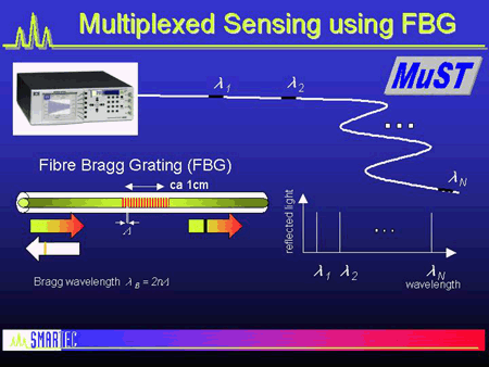 準分布式或多路復用傳感器:被測量沿著單根光纖在許多固定的離散點處確定光纜。最常見的例子是多路復用FBG。