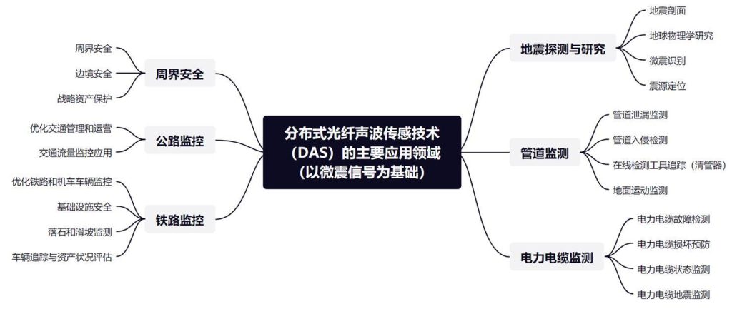 基于光纖的分布式聲波傳感器(DAS)是一種利用光纖中的后向瑞利散射(RBS)來定位和恢復光纖鏈路上的任意位置處機械振動信息(振幅、相位和頻率)的技術 。由于機械振動通常能夠在介質中傳播很遠,DAS 能夠檢測遠離光纖的事件;基于光纖的低損耗特性,傳感光纖的長度可達數(shù)千米至上百千米,因此 DAS 系統(tǒng)的探測覆蓋范圍非常廣;DAS 的振動檢測帶寬可高達數(shù)十千赫茲,可以包含待測事件的豐富信息 ;傳感光纜具有本征安全、抗電磁干擾、耐惡劣環(huán)境等優(yōu)勢。這些優(yōu)點使得 DAS 在周界圍欄安防、管道安全監(jiān)測、井下資源勘探等長距離應用領域中有著巨大的應用潛力,并且其應用領域仍在不斷拓展中。